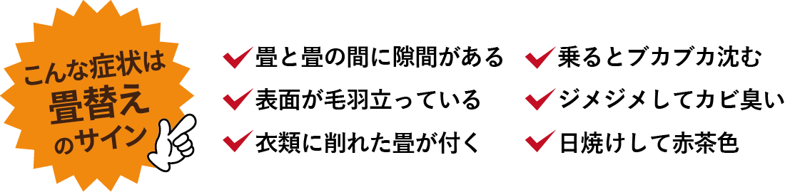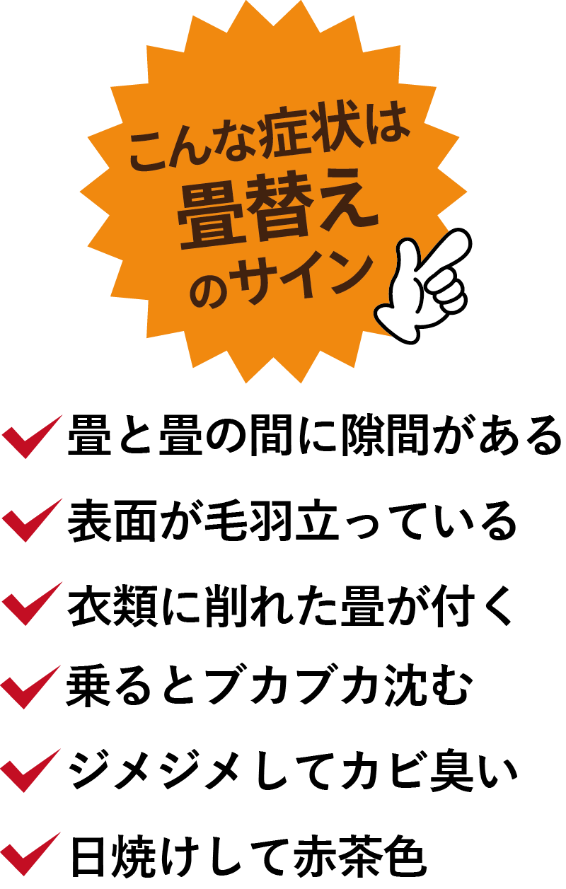 畳床も含めて全体を新品に取り替えます。 適度な弾力性がなくなったり、凹凸が激しくなったり大きな隙間が出来たら、新畳に入れ替えです。